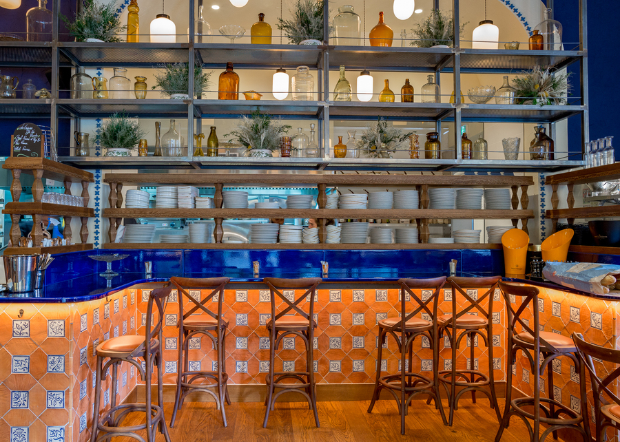 Un immense comptoir accueille les clients. Sa façade est ornée d’un carrelage sur mesure fait à la main, surmontée d’une impressionnante piste de bar en lave émaillée bleu roy, le tout couronné par un verrier monumental où foisonnent verreries, bouteilles et plantes, à l’image de la générosité de l’équipe au service.