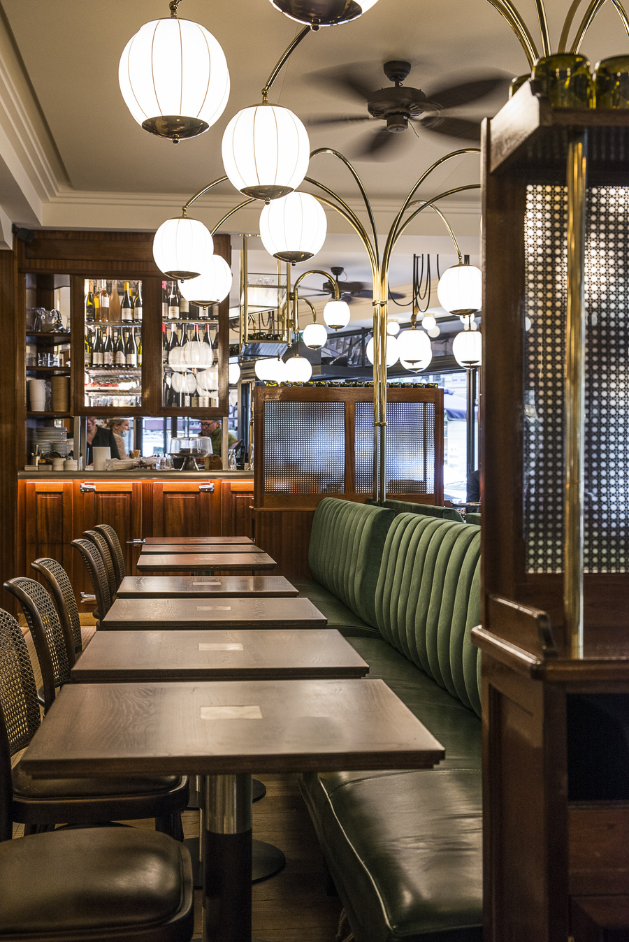 D’autres détails viennent parfaire ce nouvel habillage : une mosaïque sur mesure que l’on découvre sur le bar et sur les piles de la salle, des ventilateurs en bois tressé et de grands luminaires sur mesures surplombent l’espace.
