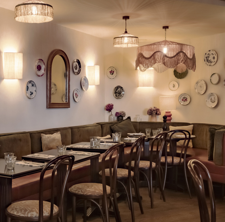 Le sol d’origine a été conservé, tandis que le bar, l’arrière-bar et les perspectives ont été repensés pour offrir un espace plus lumineux et aéré. Le décor, qui mêle modernité et tradition, évoque l’atmosphère d’une maison de famille, enrichie de touches bohèmes : luminaires à franges, vaisselle vintage et lampes en céramique ajoutent une chaleur douce et une touche d’intimité.